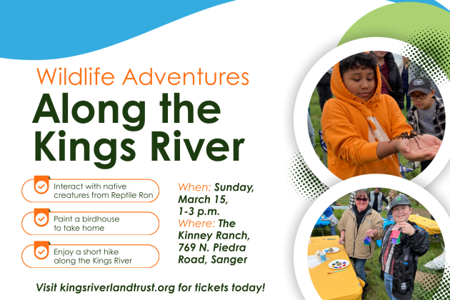 Let's get wild this spring on the Kings River! Join us for Wildlife Adventures Along the Kings River on Sunday, March 15, from 1-3 p.m. at the Kinney Ranch, 769 N. Piedra Road, in Sanger.