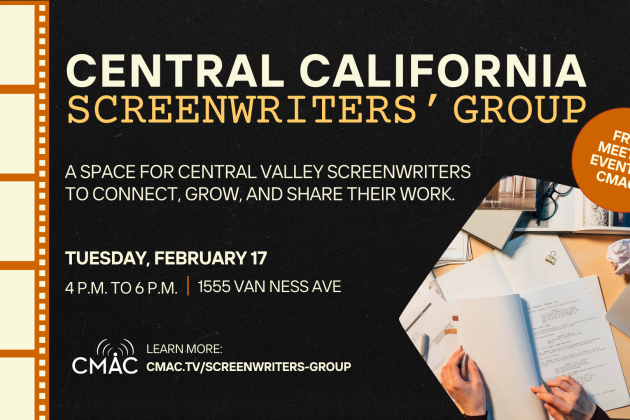 Calling all writers, storytellers, and screen dreamers! Join the Central California Screenwriters' Group, a creative community for writers looking to sharpen their craft, share work, and connect with fellow screenwriters right here in the Central Valley.This monthly group, hosted at CMAC, is open to screenwriters at any level of experience. Led by Candace Egan from the Central California Film and TV Institute at Fresno State, each session will offer professional instruction, writing exercises, and peer feedback in a supportive environment. We’ll go over group structure, provide an overview of upcoming activities, and give everyone a chance to share their goals as screenwriters.