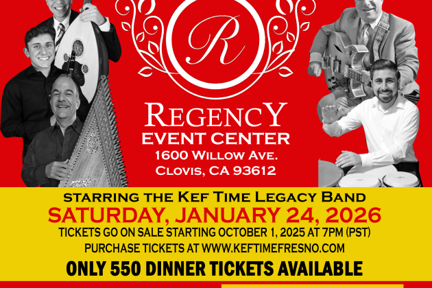 Feel the excitement as you dance and listen to the next generation of traditional Armenian musicians, the Kef Time Legacy Band. On Saturday, January 24, 2026, doors will open at 5:30PM to the elegant banquet halls of Regency Event Center in Clovis, CA, followed by a dinner served at 6:30PM. The dinner menu includes Beef Filet Kebab, Chicken Kebab, Pilaf, Cheese Boreg, Salad, & Pita Bread.